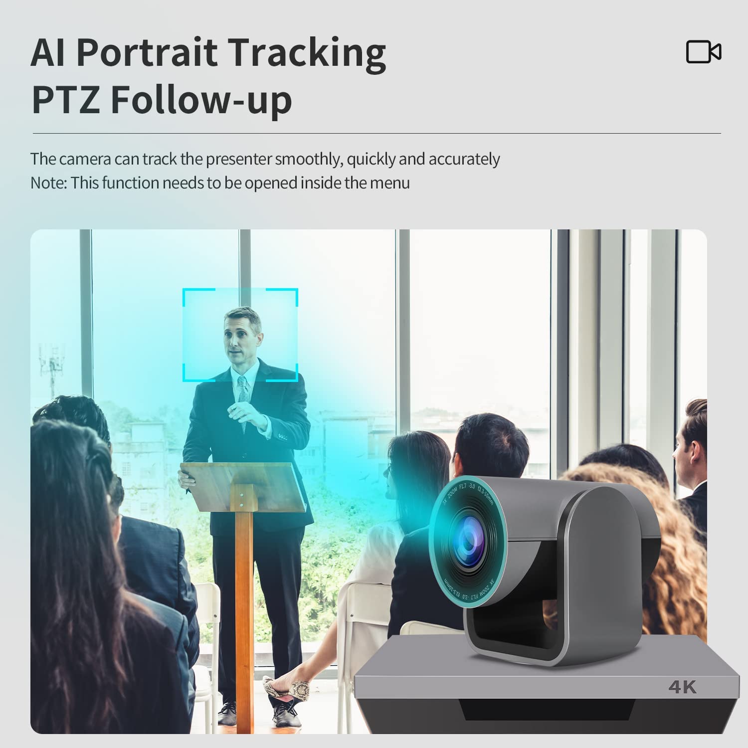 - AI PTZ camera 4K with auto-tracking function, artificial intelligence algorithm for human tracking, the lens can follow your every movement and rotate. With auto-zoom and framing, you will always be the center of the stage.