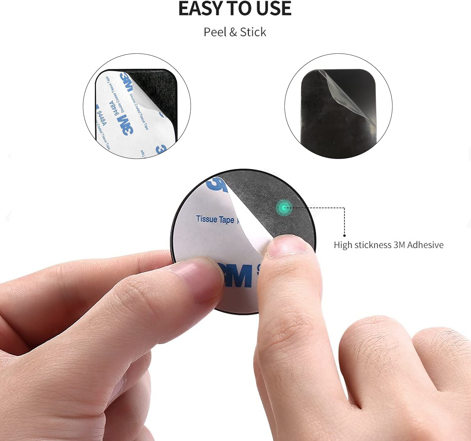 Stick to the back of your phone or put it between your phone and the case。The 3M Adhesive magnetic plate has strong adhesion, which can keep your equipment stable and safe during driving.