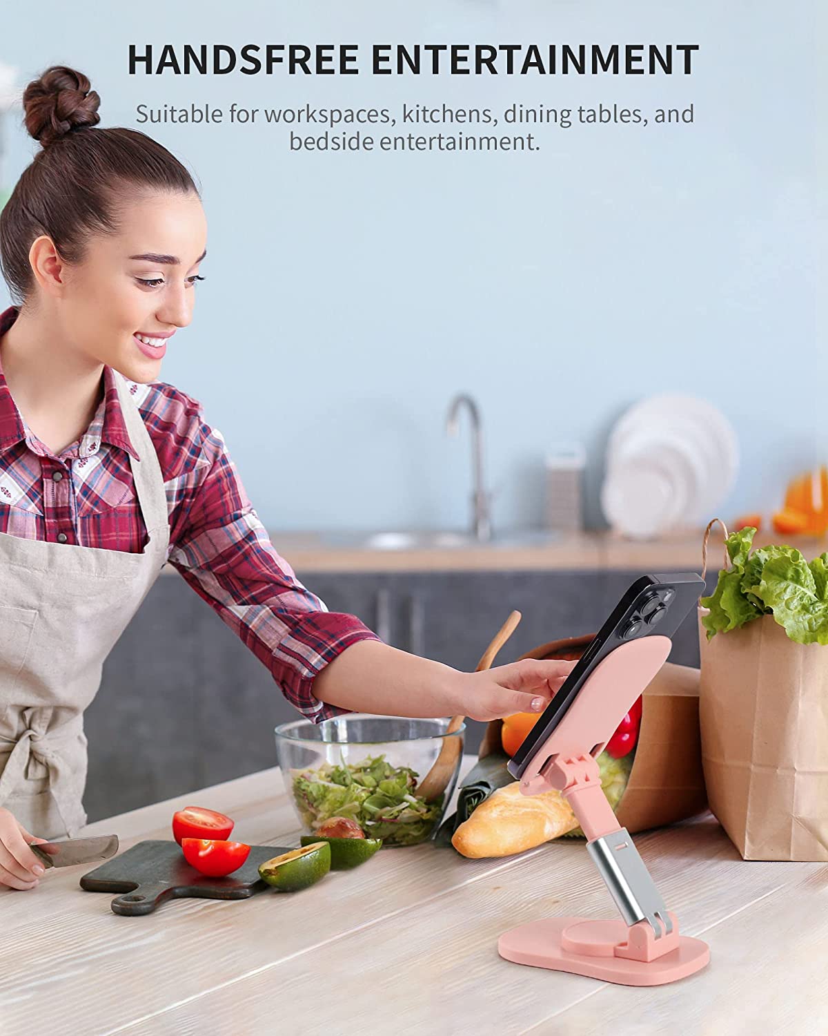- HANDS-FREE ENTERTAINMENT - Having this desktop phone holder to prop up your phone and adjust it to the ideal position, you can free your hands while watching videos, making phone calls, using Facetime, and viewing recipes. Plays a good role in your office, kitchen, nightstand, or dining table.