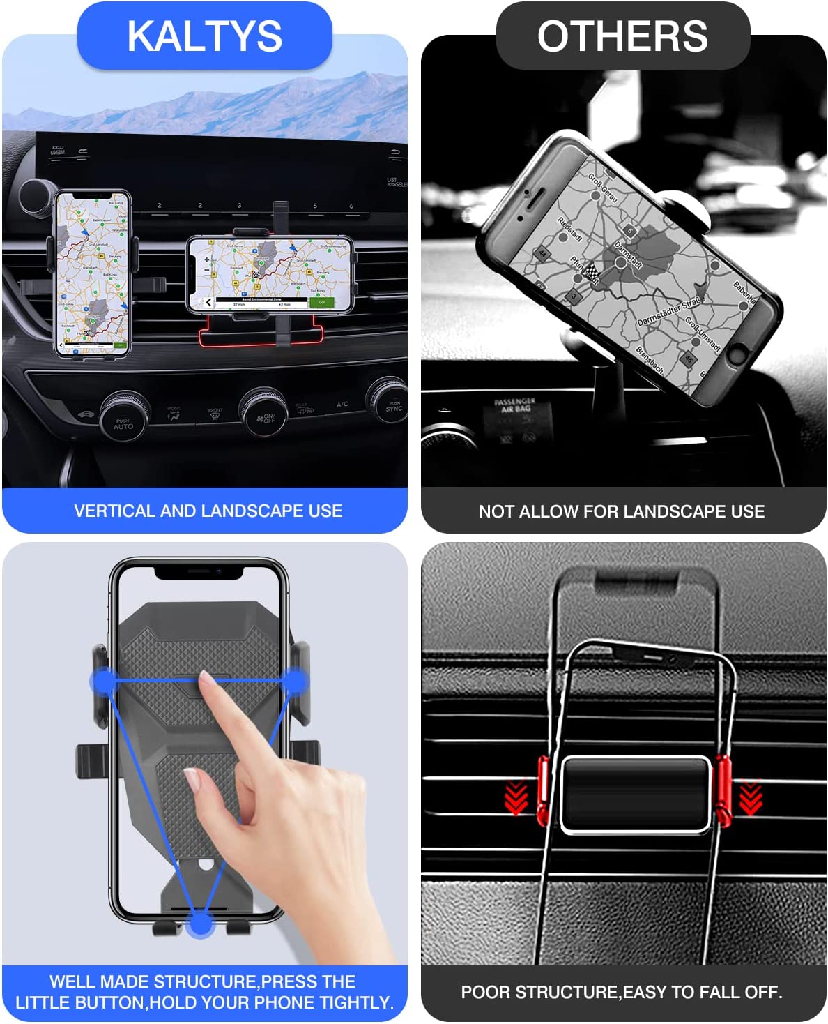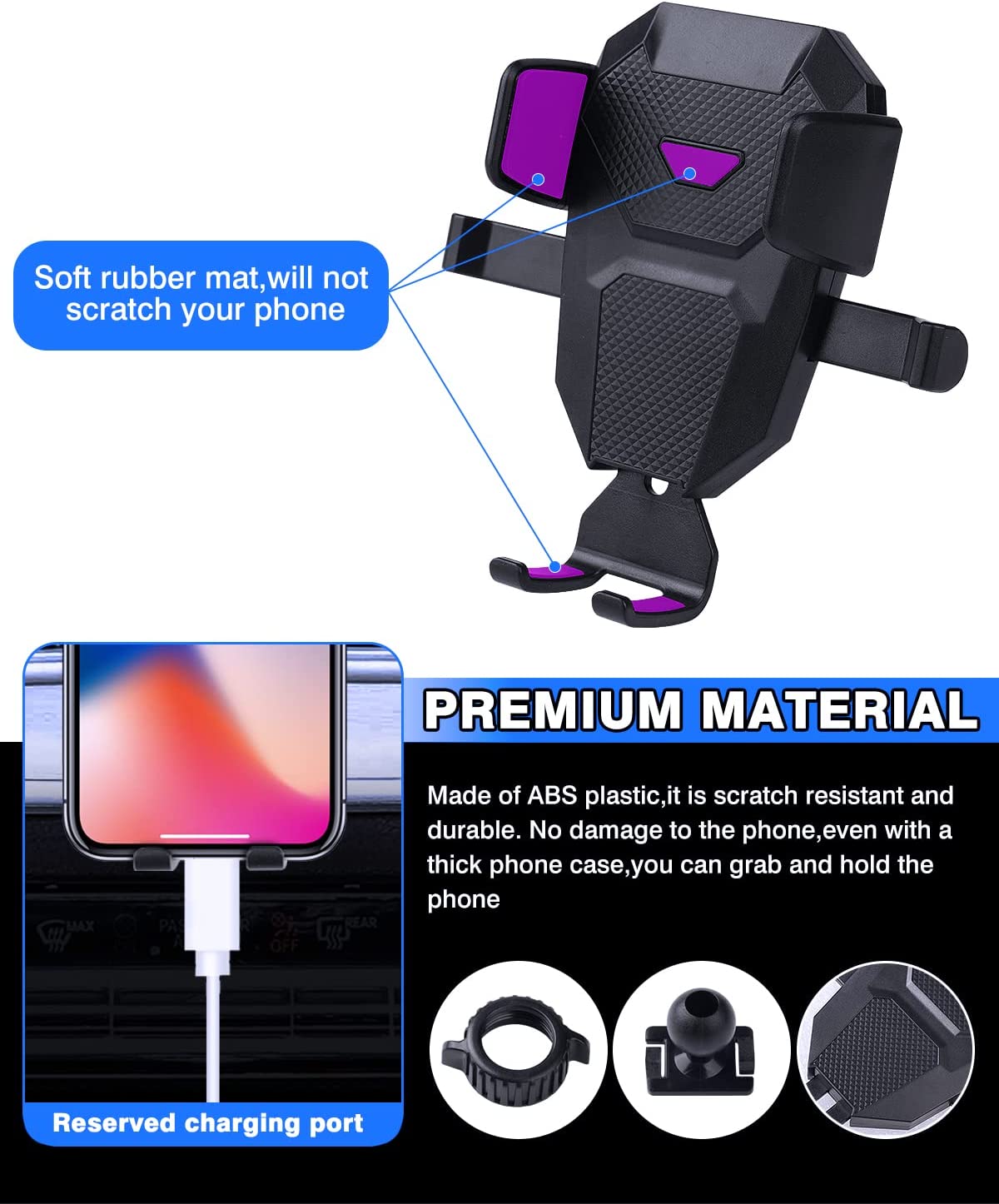 【Fairly Easy to Install】Align, press and snap the phone holder base to the air vent and put the mobile phone holder to the bracket. Please loosen the nut a little when you want to adjust the angle. High quality ABS material with soft rubber pad inside the clamps and bottom foot, safe, sturdy and durable, won’t fall out once installed.