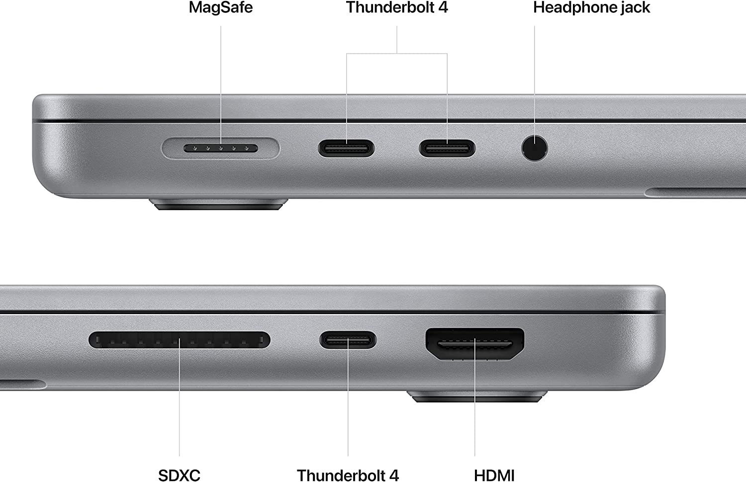 CONNECT WHAT YOU WANT — MacBook Pro features a MagSafe charging port, three Thunderbolt 4 ports, an SDXC card slot, an HDMI port, and a headphone jack. And enjoy seamless wireless connectivity with Wi-Fi 6E and Bluetooth 5.3.