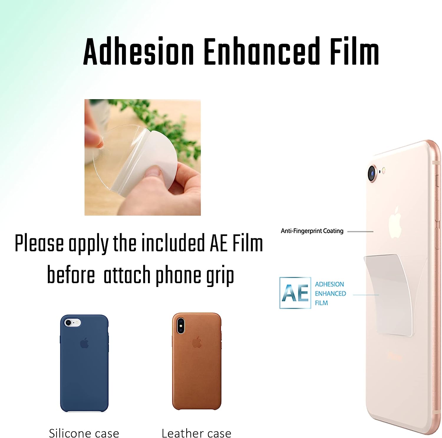 Note: Adhesion Enhanced Film is included. If you are using Liquid silicone, Leather cases or Anti-Fingerprinted Cellphones, please apply the assistive film before attaching the phone grip