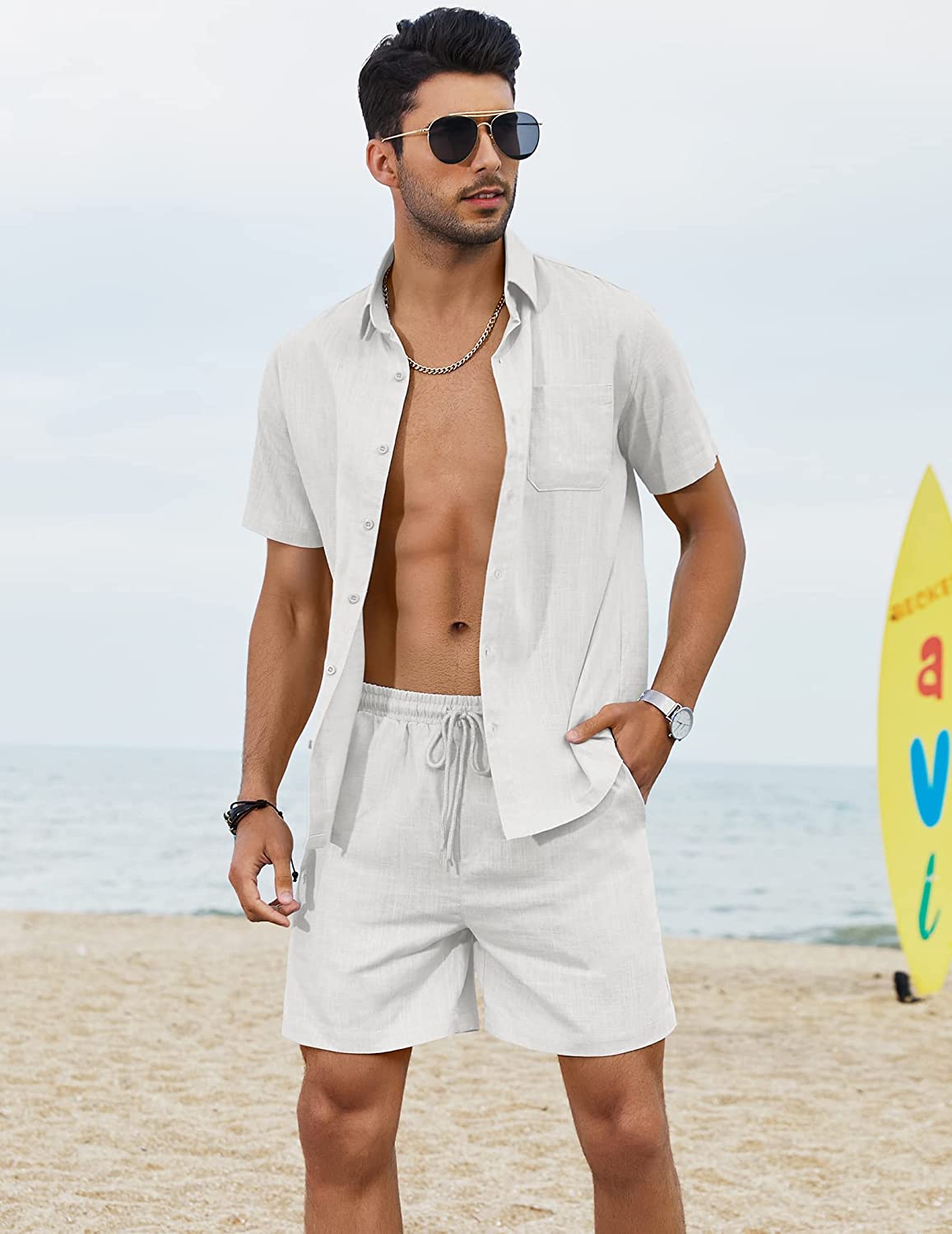 Linen is a highly breathable fabric that is soft, natural and light. Men’s linen short sleeve shirt shorts set is essential for spring and summer.