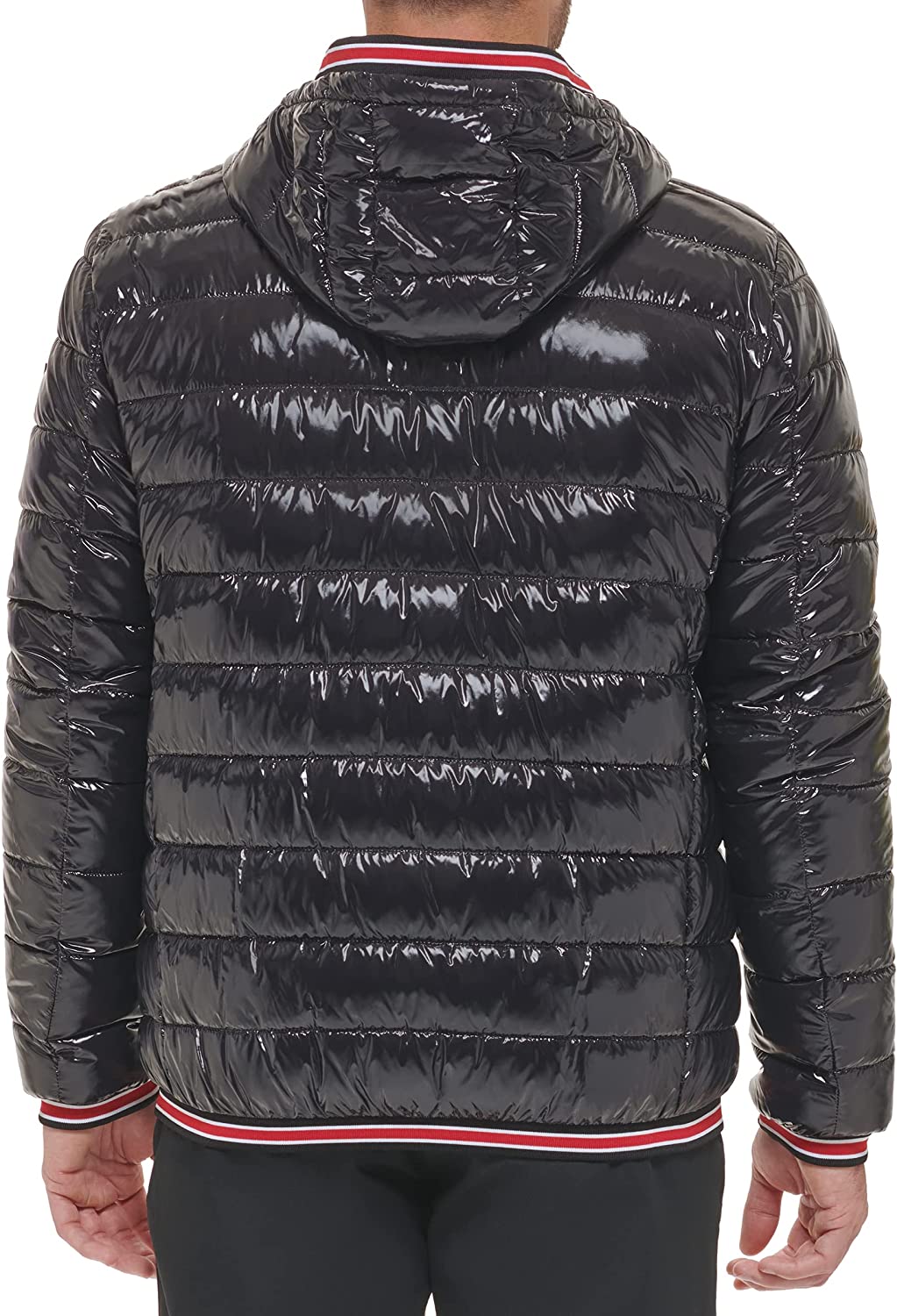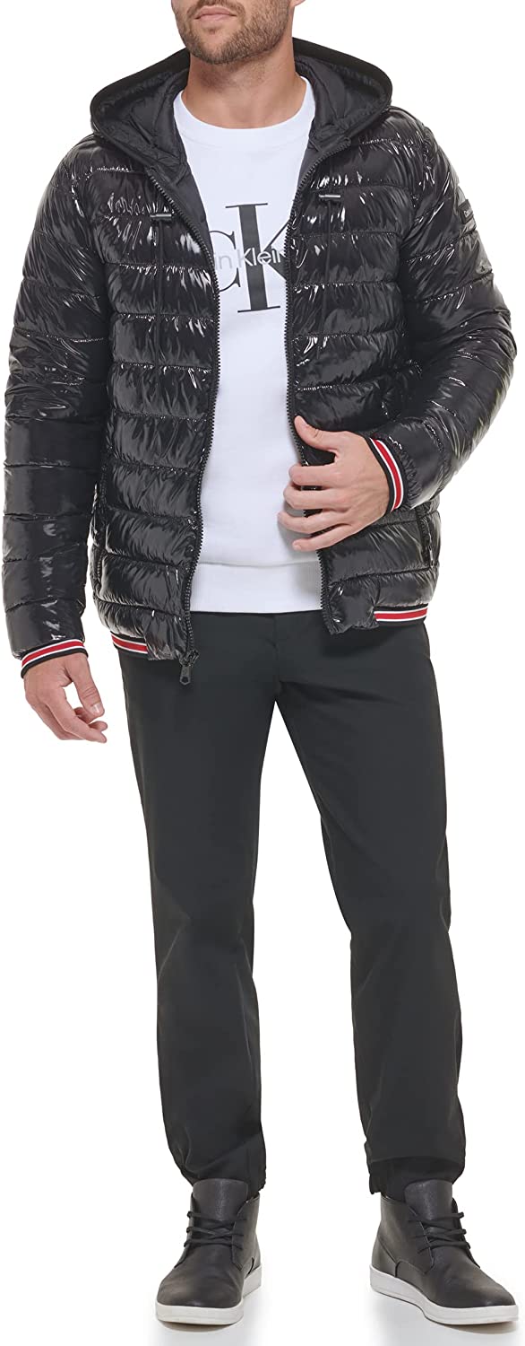 Calvin Klein men's super shine puffer with knit detail at hood, cuffs and hem