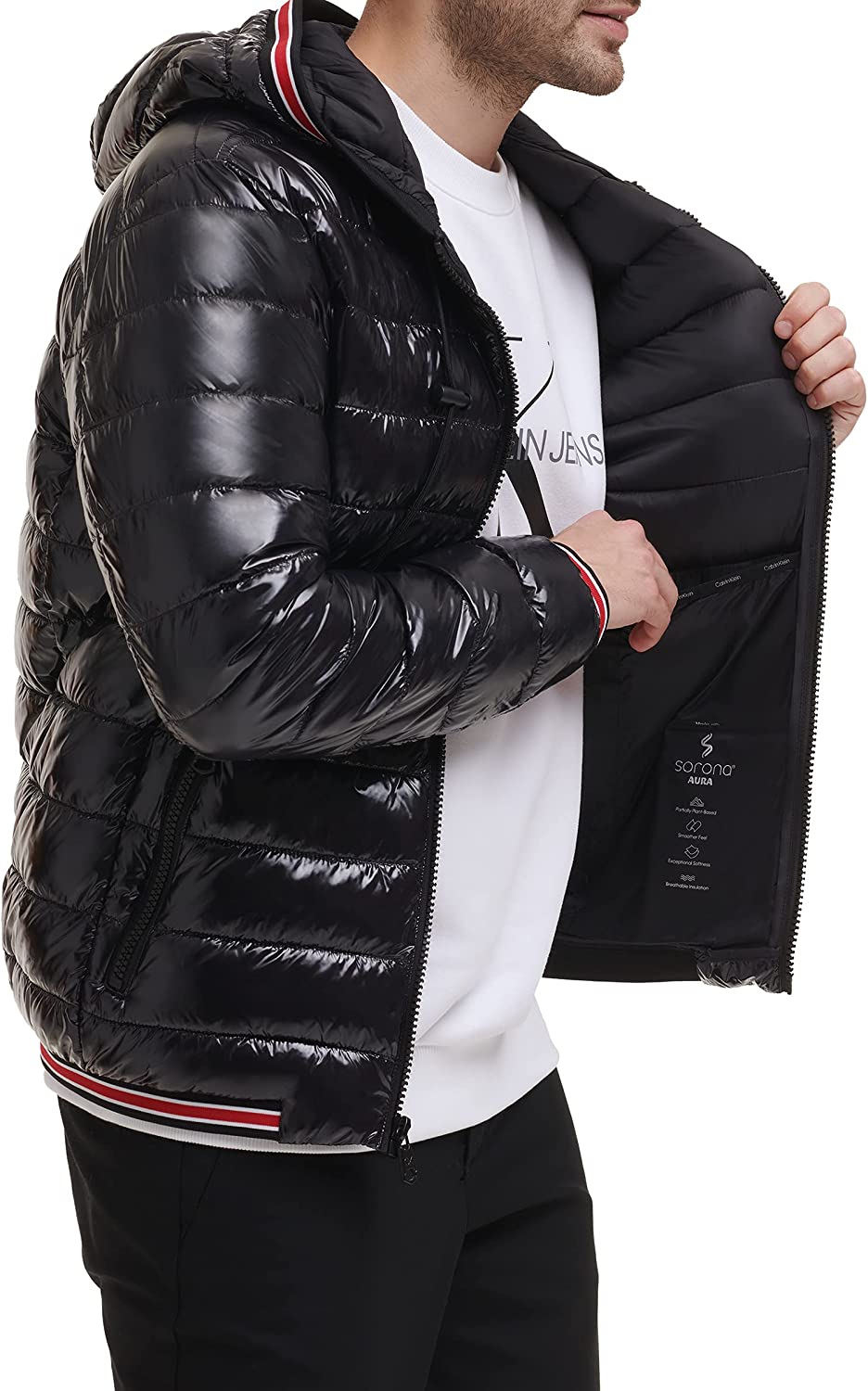 - STYLISH FEATURES: Exposed knit detail at bottom, cuffs and hood, CK branding on sleeve