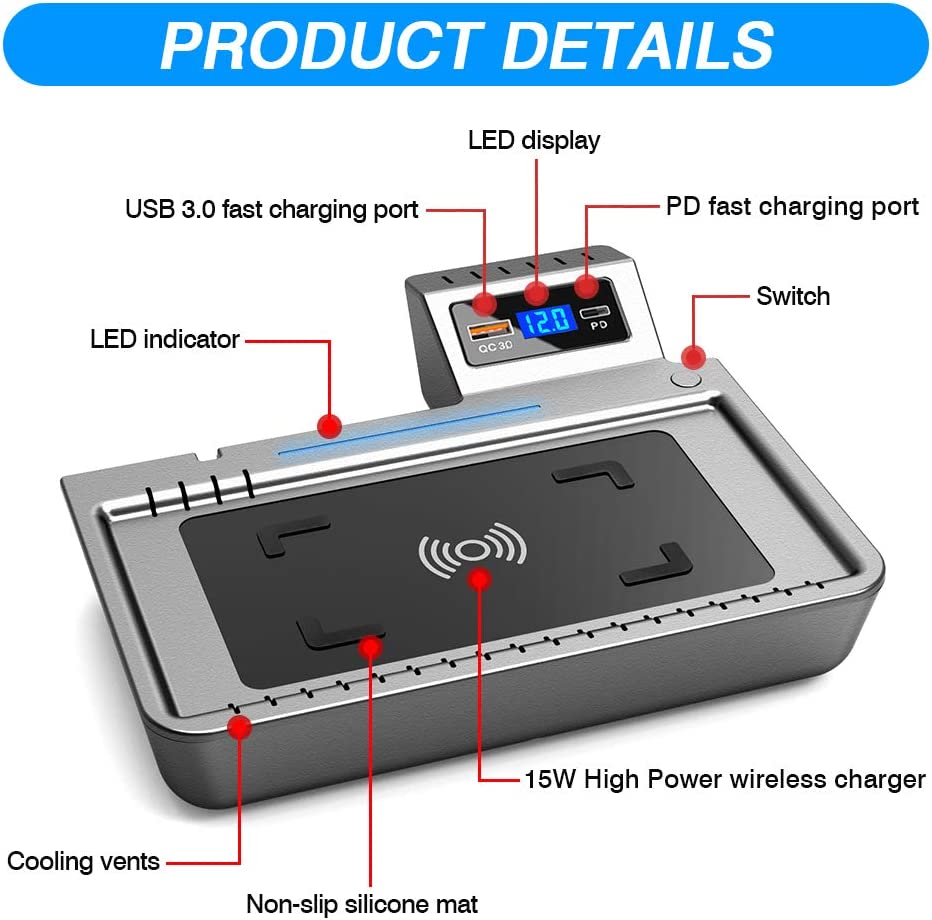 36W USB Port —— Install our wireless charger you not only own a wireless charger but also get 1 PD fast charging port, 1 QC3.0 fast charging port.2 charging ports and the wireless phone charger pad will save you from the messing with cables and cases while driving,provide the best safety protection for you.
