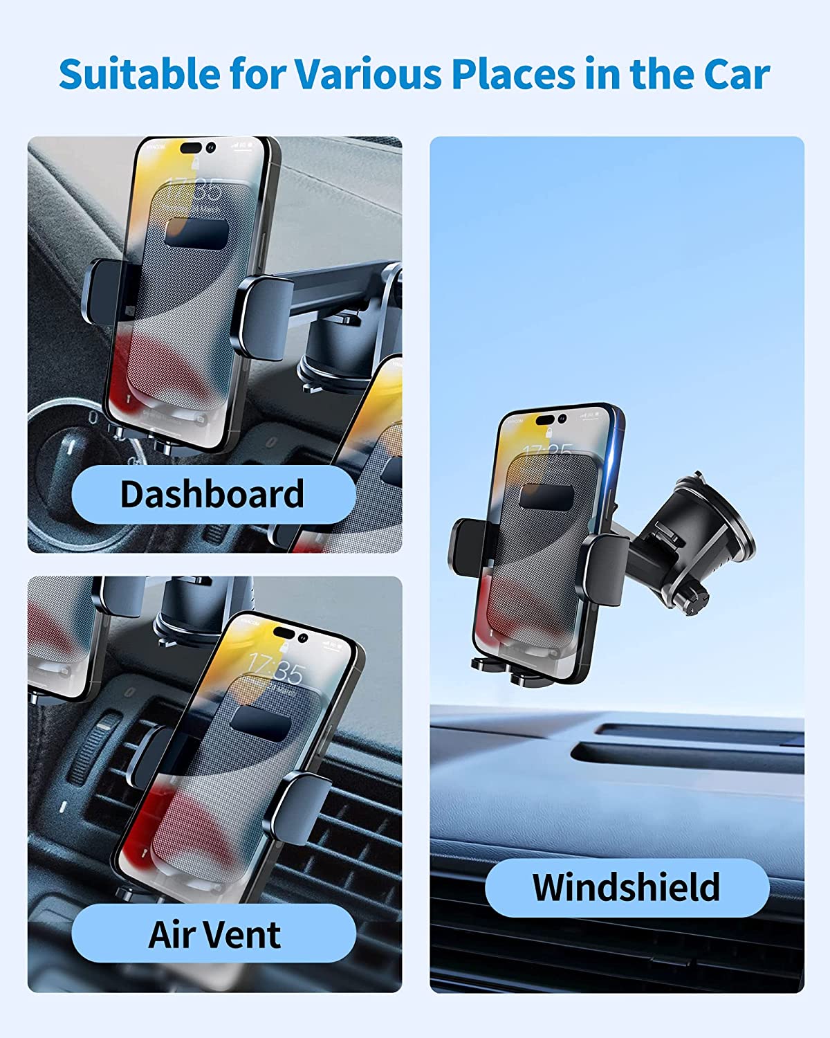 【3 in 1 Car Mount】The car phone holder can be used in the car dashboard, air vent and windshield. Car phone holder has multiple purposes, more convenient, and meets more needs in the car.