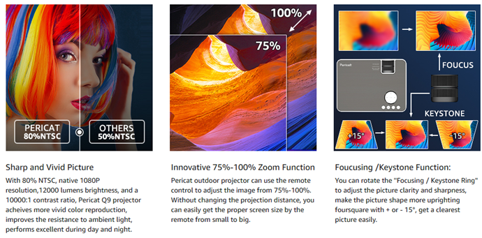 - 【Native 1080P & 4K Support 】Featured with 1920*1080 full HD resolution and 4K Support technology, Pericate Q9 video projector restores the true color of the picture without downscaling or compression, provides clear and high definition images to reduce eye irritation.