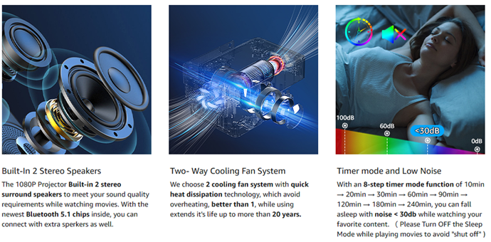- 2 Cooling Fan System - Quick heat dissipation to avoid overheating, extends the movie Projector's life up to more than 20 years.