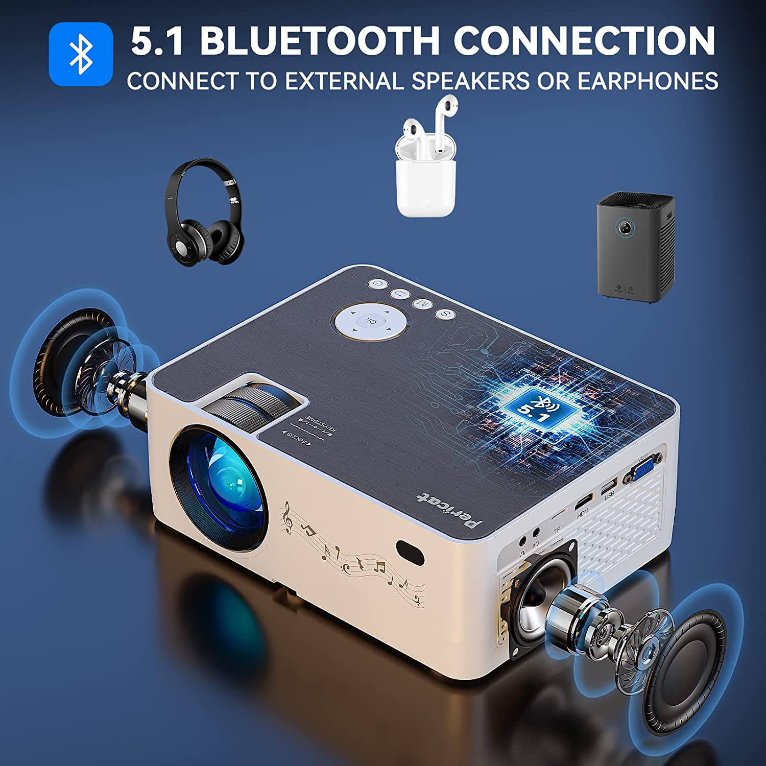 - 【2.4G+5G WIFI & 5.1 BLUETOOTH CONNECTION】Compared with other basic video projector, our WIFI Bluetooth projector support both wireless and wired projection for IOS and Android systems. 5G WIFI connection ensure you smoother and lag-free online video streaming and gaming online experience. The 2 Built-in 4x3W HiFi Stereo Speakers give you surrounded sound quality. You can also plug in external speakers via the 3.5mm Aux port for better sound by the upgraded 5.1 Bluetooth connection.