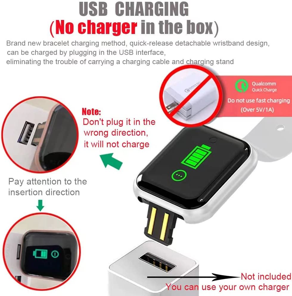 (5) Charging method: Just take out the strap and plug it directly into the USB port to charge(USB charger not included,you need to use your own USB charger).