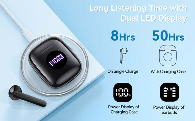 - 1.[Up to 50 Hours Playback with Wireless Charging Case] On single charge, CAPOXO N7 wireless earbuds last around 8 hours (at 50%-60% volume). With recharges provided by its compact charging dock, you can use them non stop for 50 hours. And the charging box works for wireless and plug in charging, making charging more convenient. Also the Built-in Dual LED power display allows you to grasp the remaining power of the charging case and the charging status of the earbuds in real-time.