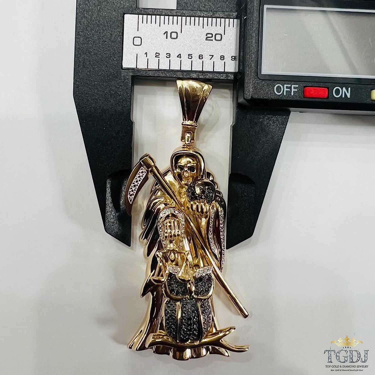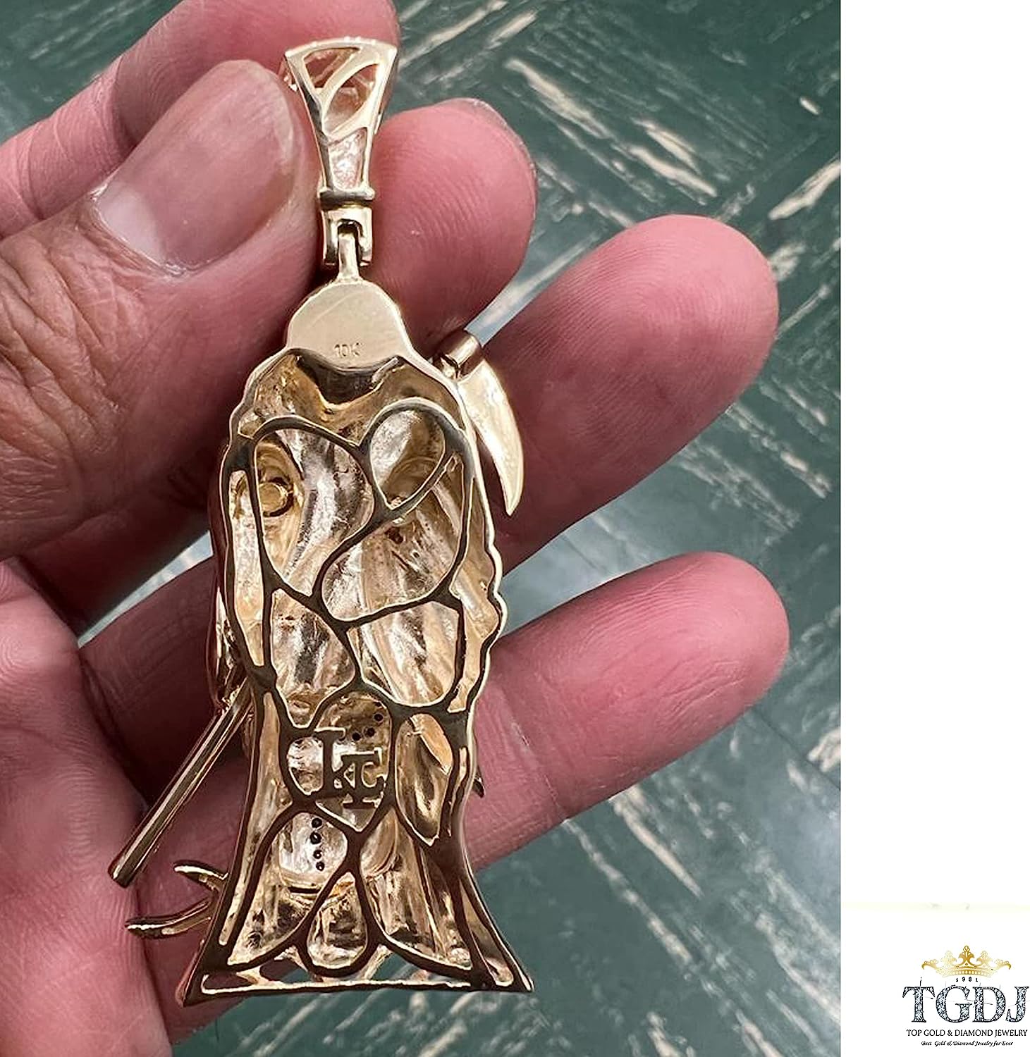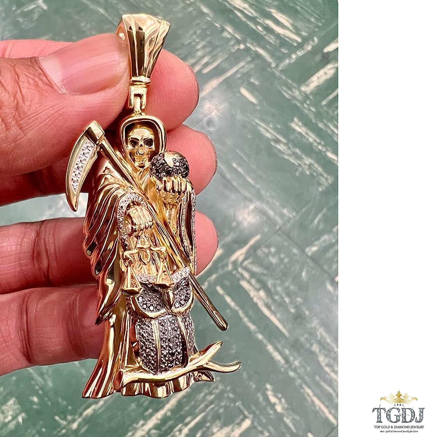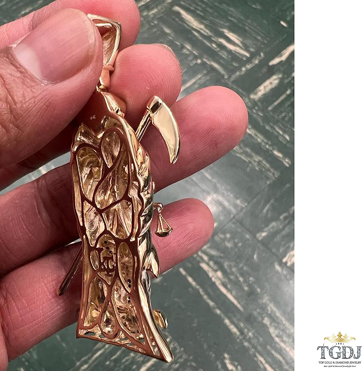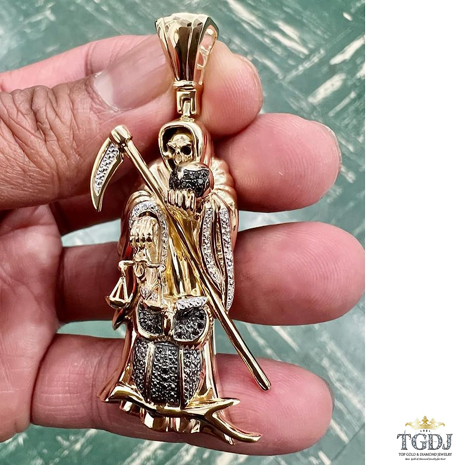 10K Yellow Gold Diamond Santa Muerte Grim Reaper Pendant For Men and Women | 2.9 x 0.9 inch Round Cut Real White Diamond Holy Death Santa Muerte Mens Pendant 0.20 CT | Unisex Custom Jewelry Gift for H