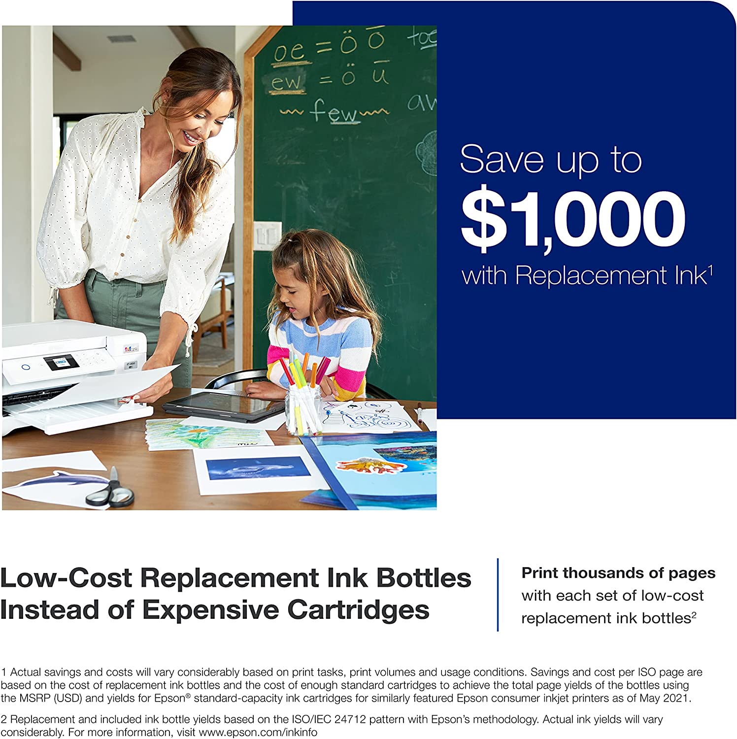 - Dramatic Savings on Replacement Ink ― Save up to 90% with replacement ink bottles vs. ink cartridges (1) – that’s enough to print up to 7,500 pages black/6,000 color (2), equivalent to about 90 individual ink cartridges (3)