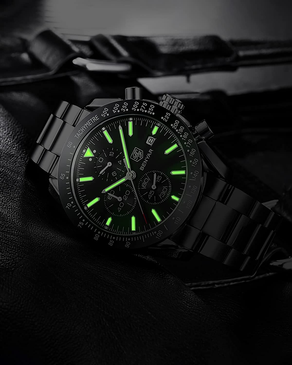 - ⌚ ELEGANT DESIGN: BY BENYAR offers a wide range of stylish luxury wrist watches specially crafted for men. The watch comes with 100% strong glass, black dial and tachymeter topring. The genuine stainless steel band with width 2.2cm and length 22cm give the watch a classy look. It is a multi-function chronograph with three sub-dial for second, minute and hour.