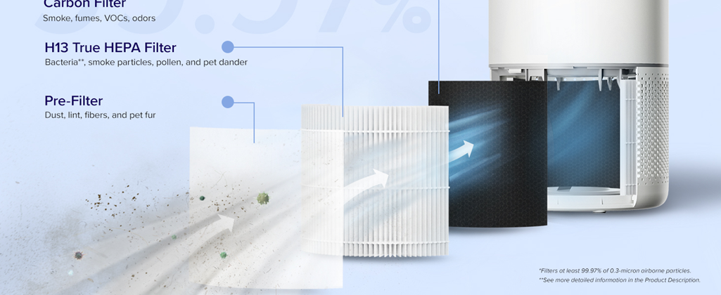 - FIND RELIF: Ease sneezing, congestion, and other allergy symptoms caused by airborne contaminants. The H13 True HEPA Filter works alongside the Pre-Filter and High-Efficiency Activated Carbon Filter to capture 99.97% of airborne particles 0.3 microns in size, such as dust, smoke, pollen, odor