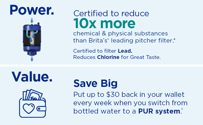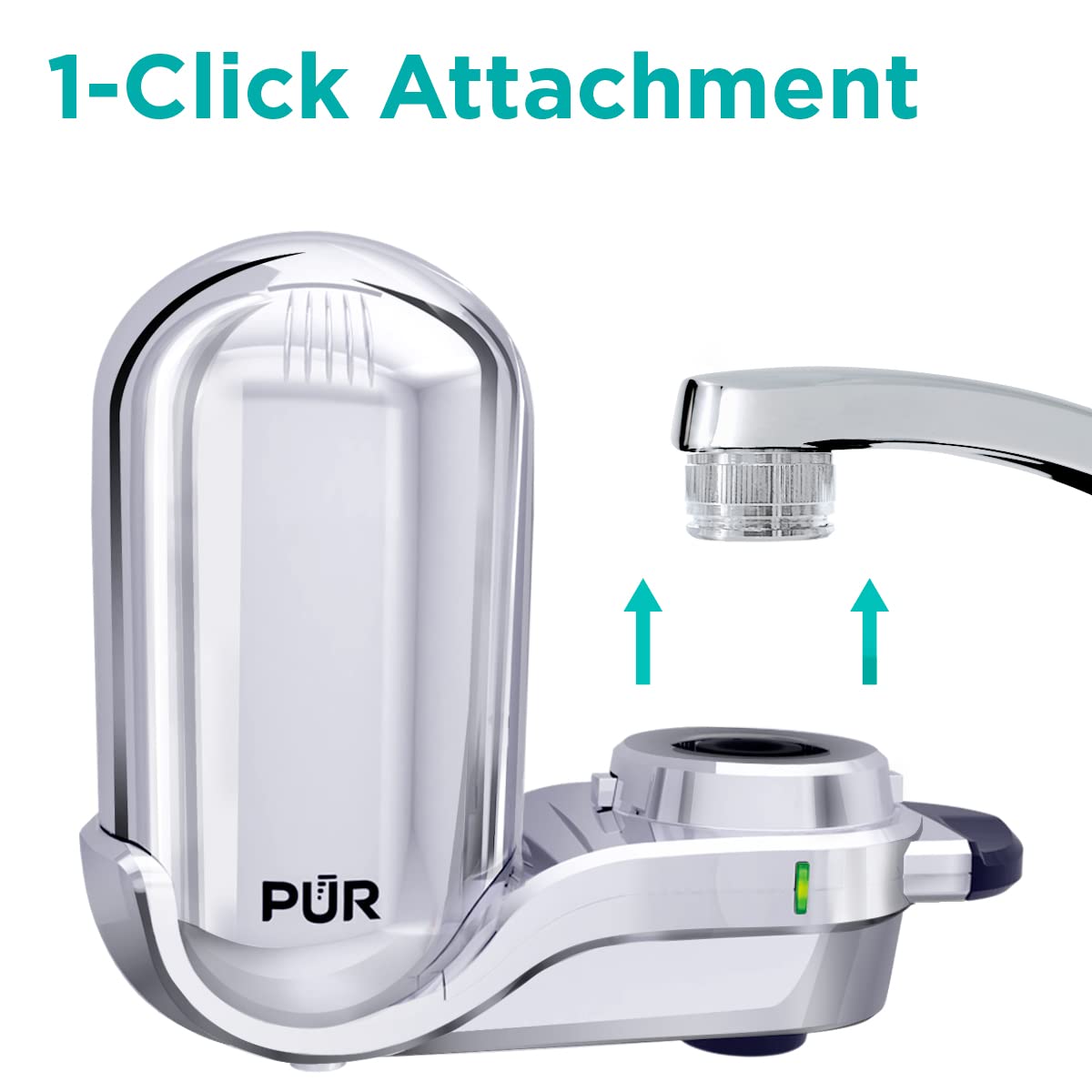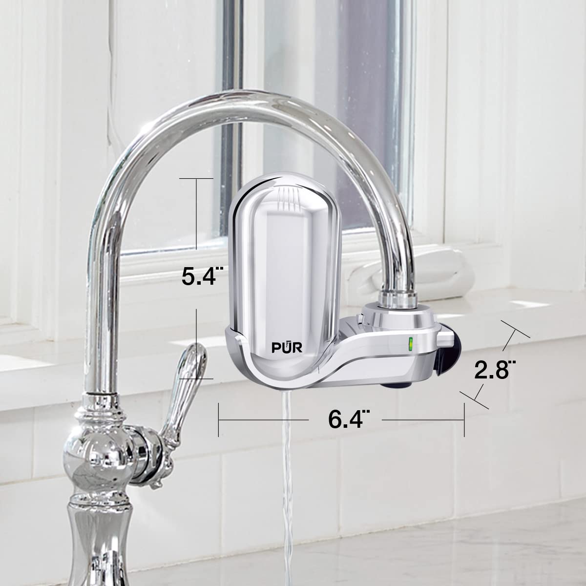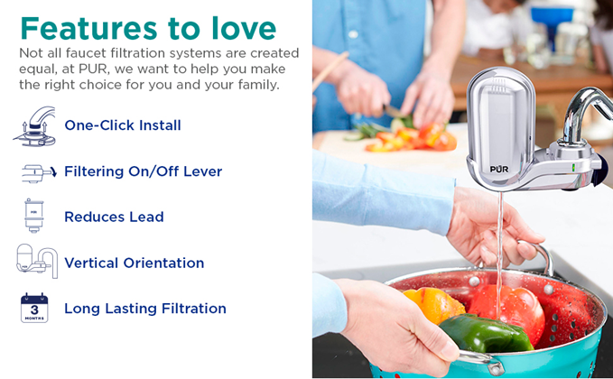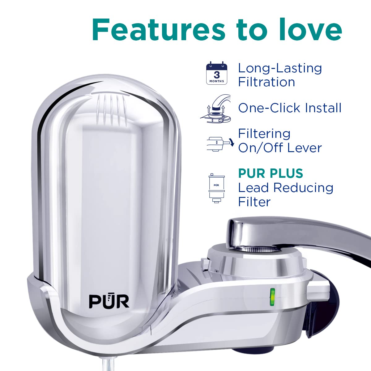 Upgrade your kitchen with this PUR PLUS Faucet Filtration System – it features a sleek design and a Filter Change Light that visibly indicates filter status, guaranteeing cleaner water straight from your faucet. Certified to filter lead and reduce chlorine for great taste. With tool-free installation and a two-year warranty, there's never been an easier or more reliable way to get PUR water. PUR PLUS faucet filter system passes water through PUR’s specialized formula of granulated activated carbon and ion exchange materials. The water flows through our advanced pleated paper, transforming your tap into cleaner water. Certified to reduce 10x more chemical and physical substances than Brita’s leading pitcher filter.* Compatible water filter replacements are not certified to offer the same water quality. Reduce plastic waste and save up to $25 per week vs the cost of bottled water.** Plus, each replacement water filter provides 100 gallons of filtered water, or up to 3 months of typical use so you can continuously fill up your reusable water bottle or pet water bowl. We believe life deserves PUR water. Disclaimers: Like other leading brands, PUR does not filter microbes. *Versus best-selling Brita® pitcher filter OB03. Brita® is a trademark of Brita LP. **Based on comparing a year's worth of bottled water (16.9 oz) to a PUR system and 9 refills. Based on Nielsen US Scantrack sales.