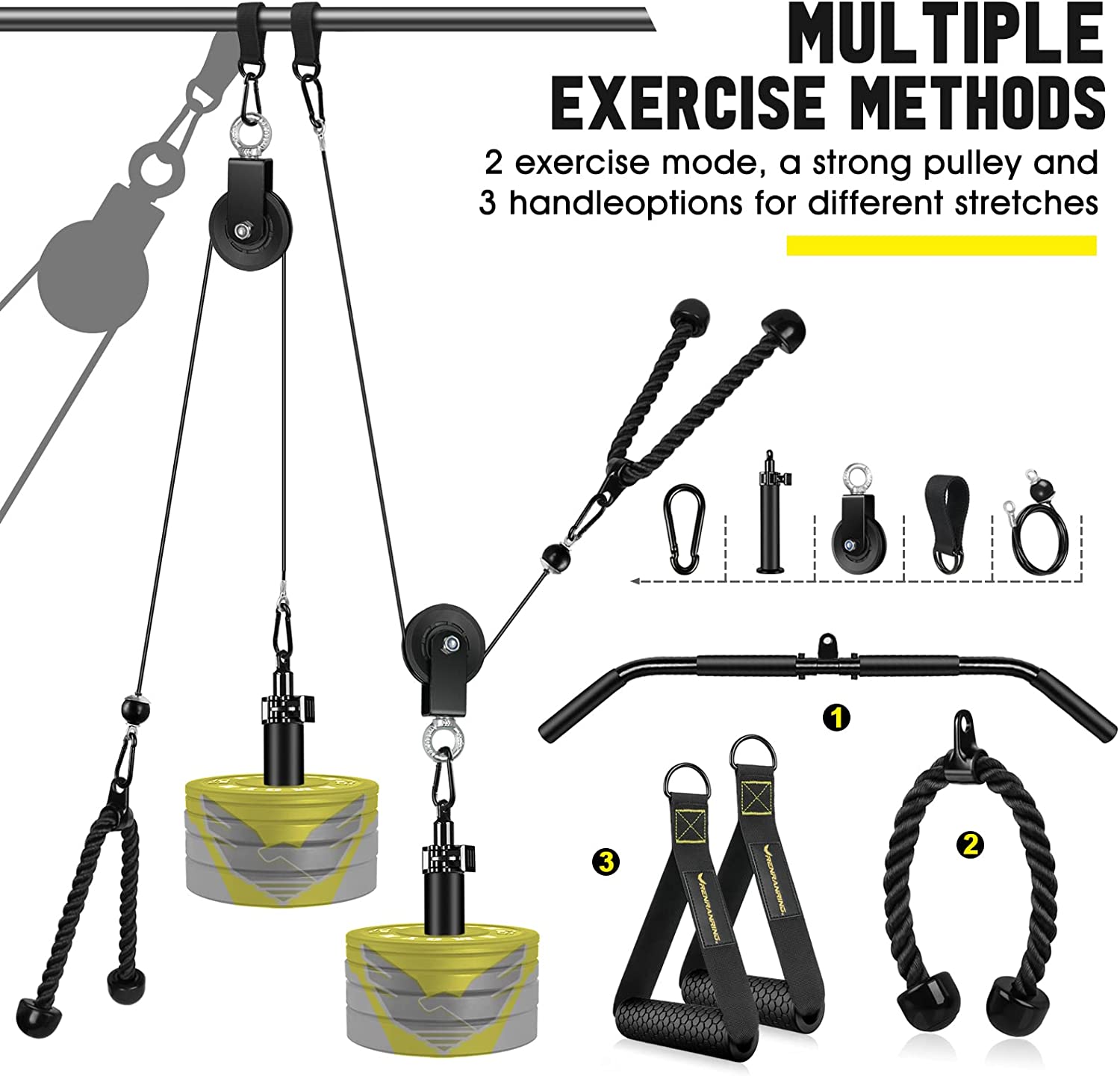 - ?【Perfect Full Body Exercise Equipment】We designed the latest pulley system gym accessories after market research and communication with fitness experts. By changing the connection ways between the hoist buckle and the high strength alloy cable, you can get multiple functional exercise methods: Biceps Curl, Triceps Pull Down, Lat Pull Down, Row, Fly etc. Can effectively help you to train full body muscles, building your core. Make you can clearly feel the muscle building up after every stretch.