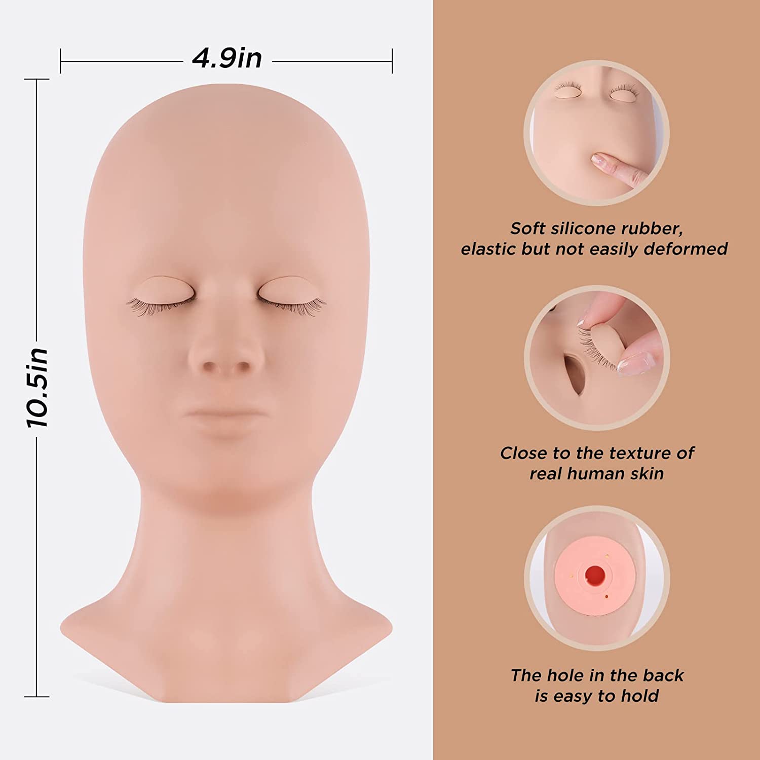 ✔️FLEXIBLE AND SOFT: The eyelash mannequin head is made of high quality silicone to prolong its service life. No odor. It is elastic, but not easily deformed. Feels like human skin, smooth, soft and elastic.The eyelids are similar to the human eyelids, providing with 3D effect, giving lash artists a more realistic operating environment.