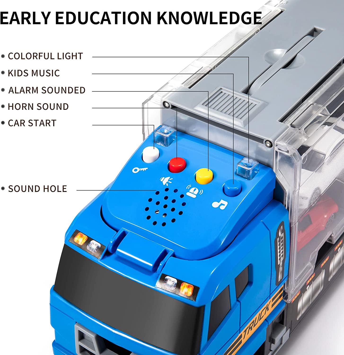 - ENRICH EARLY EDUCATION KNOWLEDGE - Our upgraded version of the race cars toy has a good early education function. Through the 4 buttons on the front of the truck, your child will see cool lights, hear the sound of the vehicle starting, the sound of the horn, the realistic police sound and the pleasant music. It is very suitable for parent-child education and cultivate children's imagination and creativity. There is a need for 2 AAA batteries (not included).