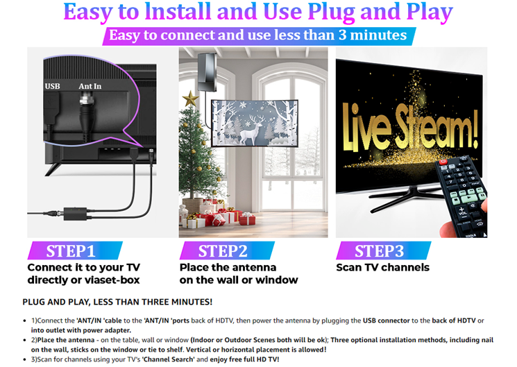• ?▷【LIFETIME FOR FREE ALL LOCAL CHANNELS】- Say goodbye to the bill! BEYOND A PURCHASE! Enjoy hundreds of 0 COST channels with no pixelation, Brings scenes to life ! Digital HDTV Antenna start to access the news, sitcoms, kids and sports programs! TV antenna can receive channels including ABC,CBS, NBC,PBS,FOX, UNIVISION, CW, ION, UMAS ect . ❗Reminder: Re-scan channels after moving the antenna.