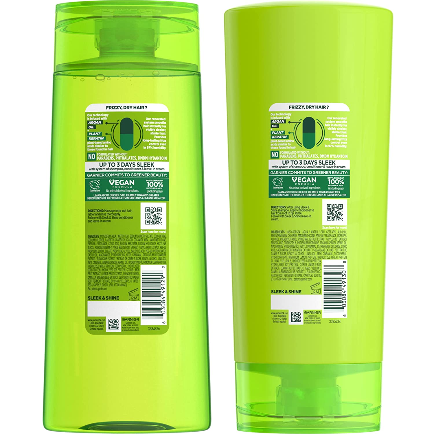 Hair is almost entirely made up of protein, which gives hair its strength. Paraben-free Fructis formulas with Active Fruit Protein, an exclusive combination of citrus protein, Vitamins B3 & B6, fruit & plant-derived extracts and strengthening conditioners, are designed for healthier, stronger hair. Fructis Sleek & Shine Shampoo with fairly & sustainably sourced Argan Oil from Morocco soaks into frizzy, dry hair to smooth each strand. Long lasting frizz control even in 97% humidity with system of shampoo, conditioner and leave in conditioner. Get up to 3 day sleek hair with Garnier Fructis Sleek and Shine system of shampoo, conditioner and leave-in conditioning cream. with system of shampoo, conditioner, treatment vs. non-conditioning shampoo.