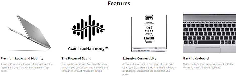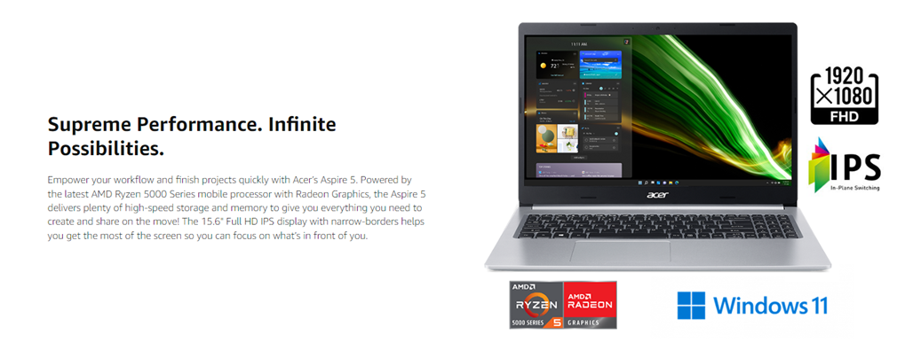 Acer Aspire 5 A515-45-R74Z comes with these high level specs: AMD Ryzen 5 5500U Hexa-Core Mobile Processor 2.1GHz with Precision Boost up to 4.0GHz (Up to 8MB L3 Cache), 15.6" Full HD (1920 x 1080) widescreen LED-backlit IPS Display, AMD Radeon Graphics, 8GB DDR4 On-Board Memory, 256GB NVMe SSD, 1 - Available Hard Drive Bay, True Harmony Technology, Two Built-in Stereo Speakers, Acer Purified.Voice Technology with Two Built-in Microphones, Intel Wireless Wi-Fi 6 AX200 802.11ax Dual-Band 2.4GHz and 5GHz featuring 2x2 MU-MIMO technology, 10/100/1000 Gigabit Ethernet LAN (RJ-45 port), Bluetooth 5.0, HD Webcam (1280 x 720), 1 - USB 3.2 (Type-C) Gen 1 port (up to 5 Gbps), 2 - USB 3.2 Gen 1 Ports (one with Power-off Charging), 1 - USB 2.0 Port, 1 - HDMI 2.0 Port with HDCP support, Backlit Keyboard, Lithium-Ion Battery, Up to 11-hours Battery Life, Windows 11 Home, 3.88 lbs. | 1.76 kg (system unit only) (NX.A84AA.005).