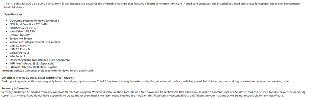 • HP EliteDesk 800 G1 / 600 G1 Desktop, Intel Quad Core i7-4770 up to 3.9Ghz, 32GB DDR3 RAM, 1TB SSD Hard Drive