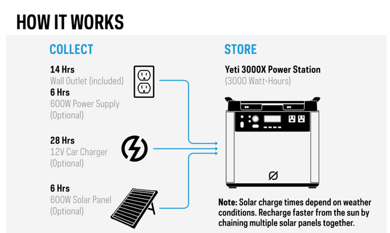 - HOME BACKUP: Back up your home with power from your Yeti 3000X. Keep your fridge running for 43 hours and your light bulbs lit for 276 hours.It can be integrated into your home’s circuits for seamless backup power with the Home Integration Kit (sold separately). For an added bonus, you can control your Yeti 3000X with the Yeti App and switch to battery saver mode as needed.