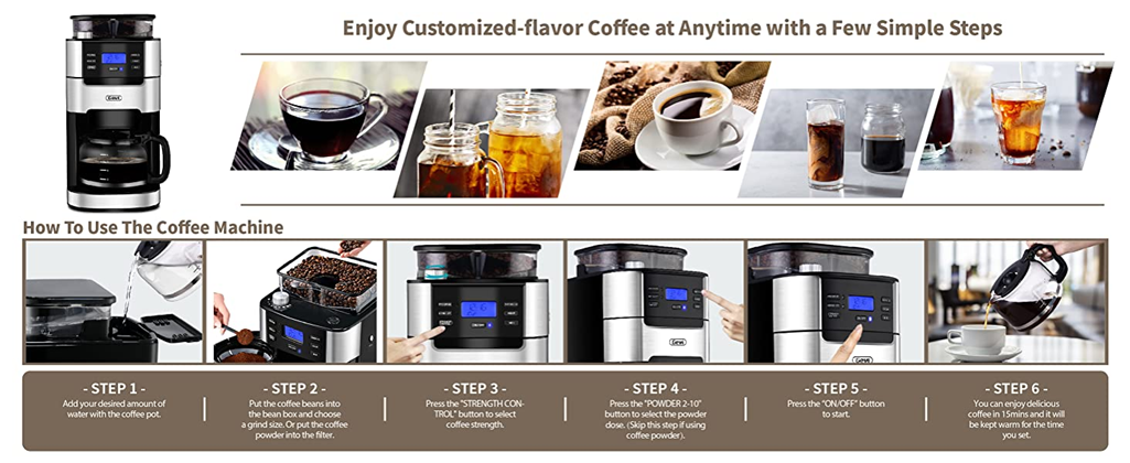 • ☕【1.5L LARGE CAPACITY】: The Grind Coffee Machine can brew up to 10 cups coffee. Set the number of coffee powder (2,4,6,8,10) through pressing "CUP 2-10" button base on your own needs. If not, the default number of cup is 10.【NOTE: when making coffee, the amount of coffee powder added should correspond to the amount of water, if the machine finishes without running out of corresponding amount of water, you can start it again.