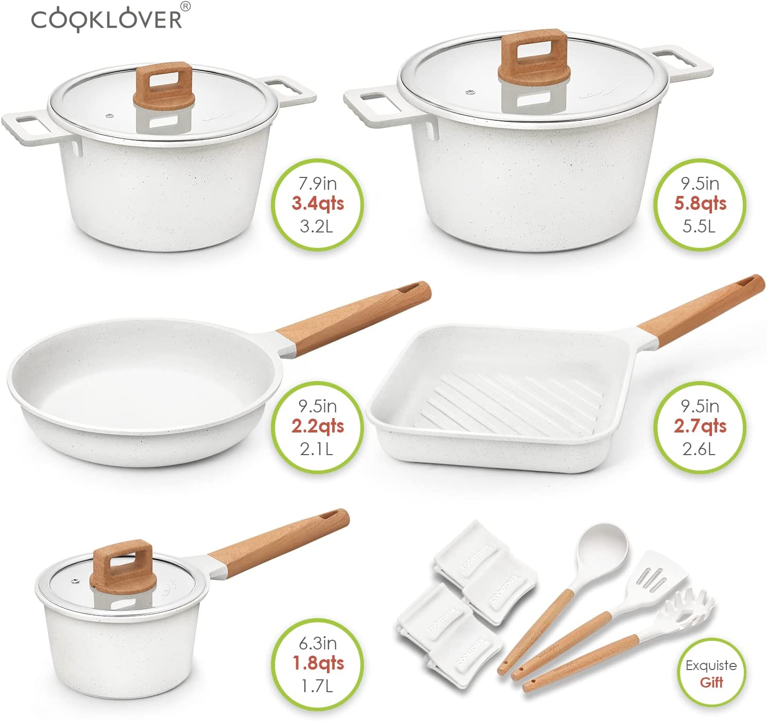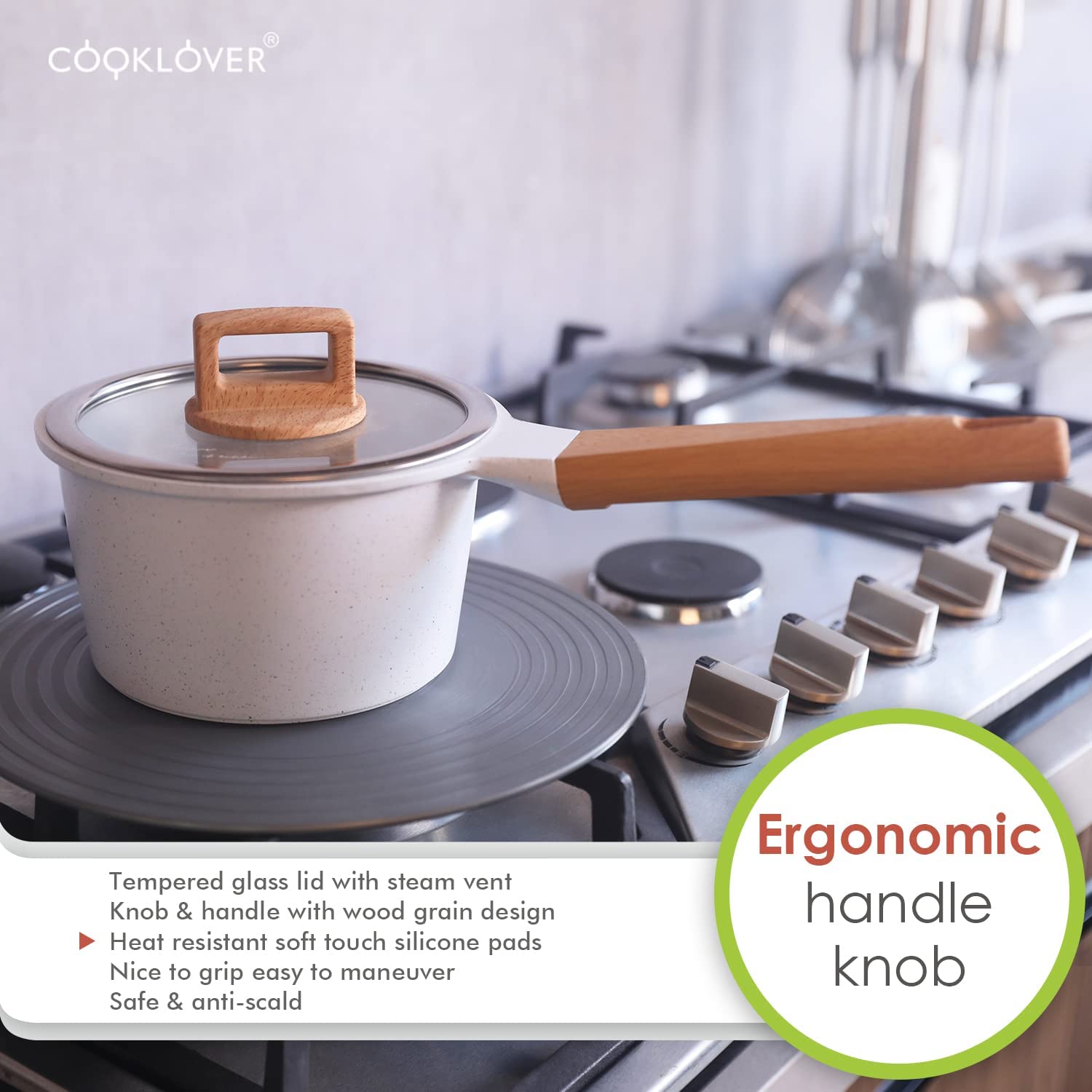 - ✅Ergonomic Bakelite knob and handle: COOKLOVER's cookware set builds with Eye-catching heat resistant soft touch silicone robust Bakelite knob and handle with beautiful wood grain design. Stay cool and comfortable. Easy to maneuver, Safe & Anti-scald. Do not put this handle directly on the fire or do not heat it for a long time.