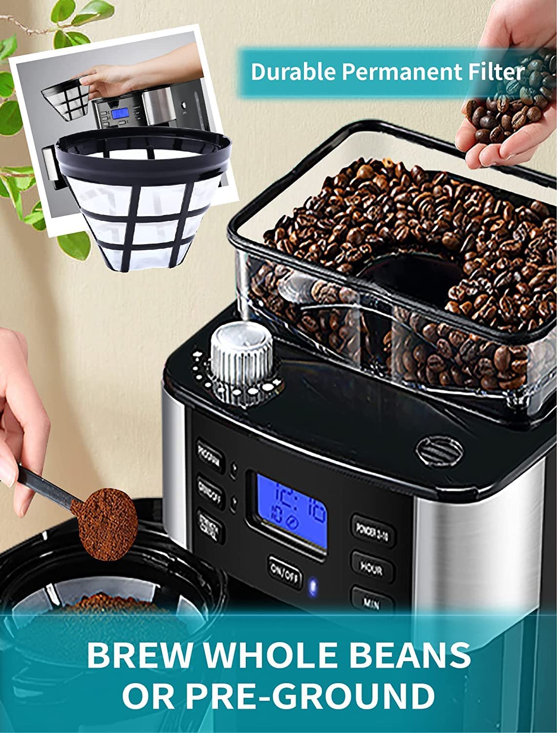 - ☕ 【AUTOMATIC START FUNCTION】: Entering the timer mode and setting the time you wanted to automatic start, the programmable timer will preset the machine start time and start brewing coffee at the specified time. There is a prompt bell after brewing. It helps to save time making coffee in the morning. After brewing, there is a warming plate design that the coffee can be warmed in the carafe lasts for 120 minutes.