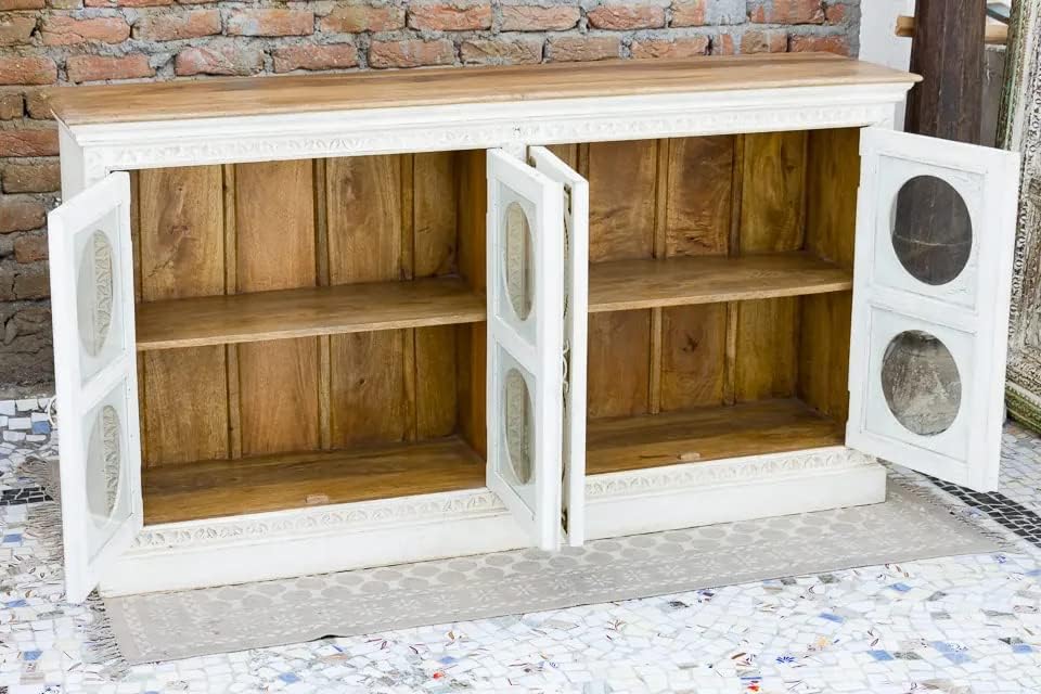 Antique Indian Brass Work Hand Carved Solid Wooden Sideboard Whitewash Mango Wood Indian Arched Sideboard Cabinet Storage Units Indian Solid Wood Finish,Living Room Bedroom Furniture,Modern Sideboard